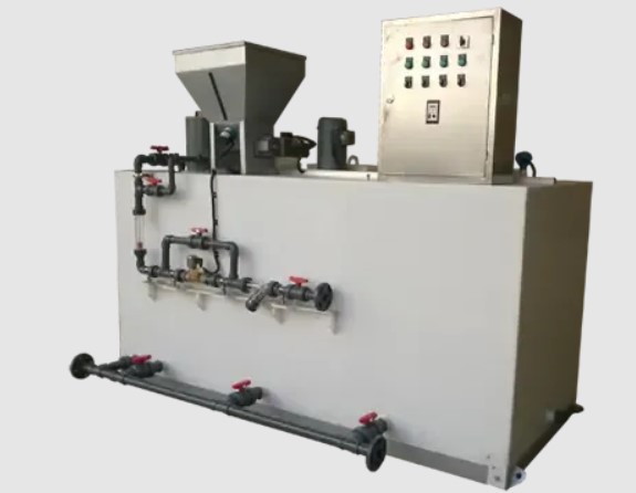 Thiết bị được trang bị hệ thống điều khiển PLC tự động, giúp toàn bộ quy trình từ cấp bột khô → phun vào tank hòa tan → khuấy trộn → bơm ra hệ thống được vận hành tự động, tiết kiệm thời gian và hạn chế lỗi vận hành bằng tay. Hộp chứa bột khô, thiết bị cấp liệu và thiết bị gia nhiệt chống ẩm giúp đảm bảo nguyên liệu khô được cấp vào một cách ổn định và đúng liều lượng. Ngăn hòa tan được trang bị vật liệu thép không gỉ và nhựa kỹ thuật chịu ăn mòn, đảm bảo độ bền và khả năng vận hành liên tục. Ngăn khuấy/trộn có khuấy cơ học hoặc từ và bộ phận gia tốc (deceleration mixer) giúp xử lý polyme có trọng lượng phân tử lớn mà không phá hủy cấu trúc phân tử, đảm bảo hiệu quả xử lý cao.